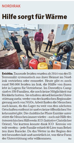 Die chaldäische Pfarre Enishke unterstützt die Menschen immer wieder – auch mit Hilfe des österreichischen Hilfswerks ICO (Initiative Christlicher Orient). Vor kurzem konnte dank ICO Kerosin verteilt werden – jede Familie erhielt 80 Liter zum Beheizen ihrer Baracke. Da das Wetter in der Region derzeit besonders kalt und unwirtlich ist, war diese Form der Unterstützung sehr willkommen.